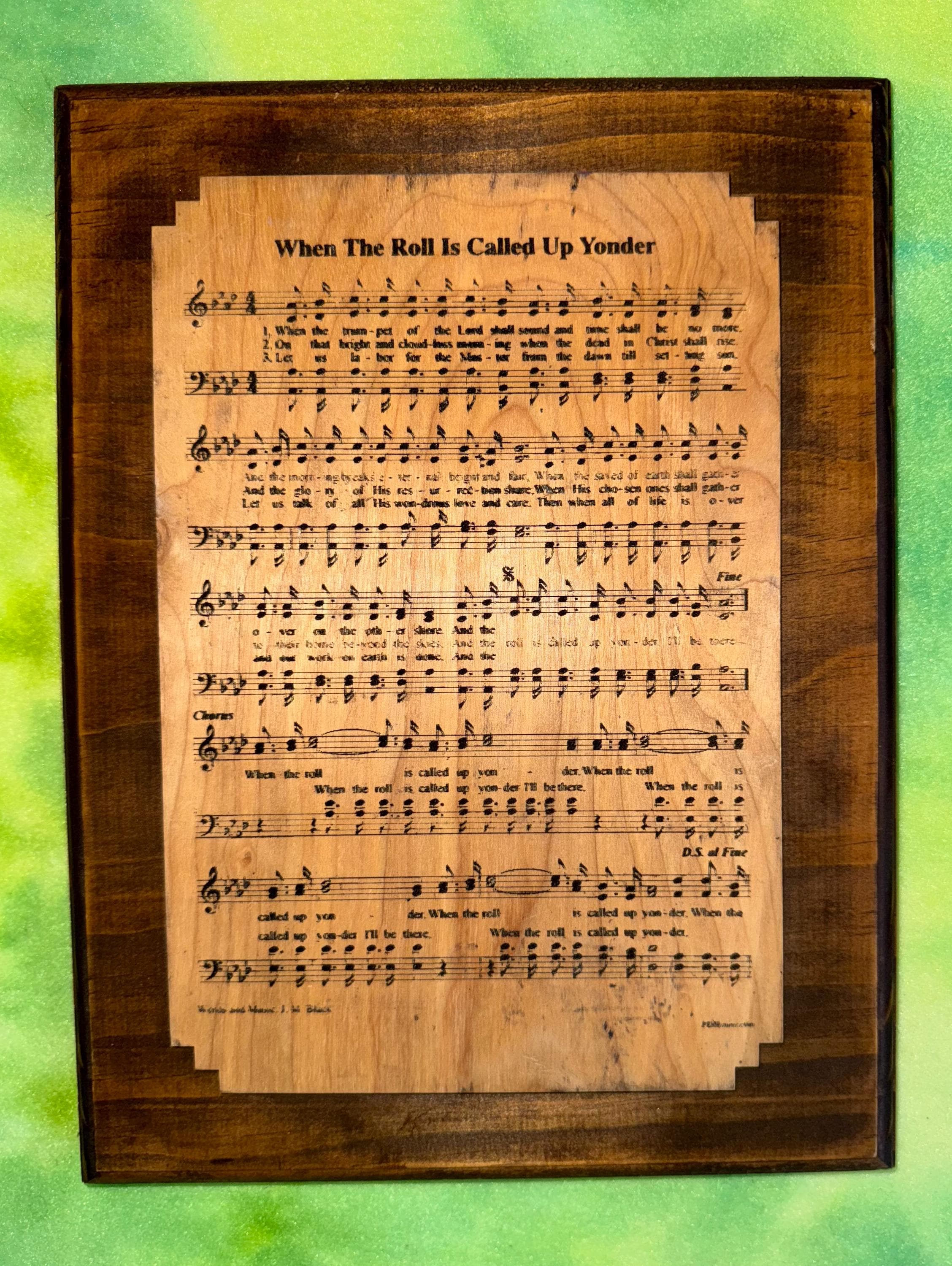 This is a When the Roll is Called Up Yonder Sheet music Plaque. It is laser engaved on birch and mounted on stained pine. This is 8 1/2 x 11 1/4. This makes a great gift! Please check out our other listings! If you do not see one you like that is not a problem. Contact us via our website and we will custom make one for you! www.ltajcustoms.com