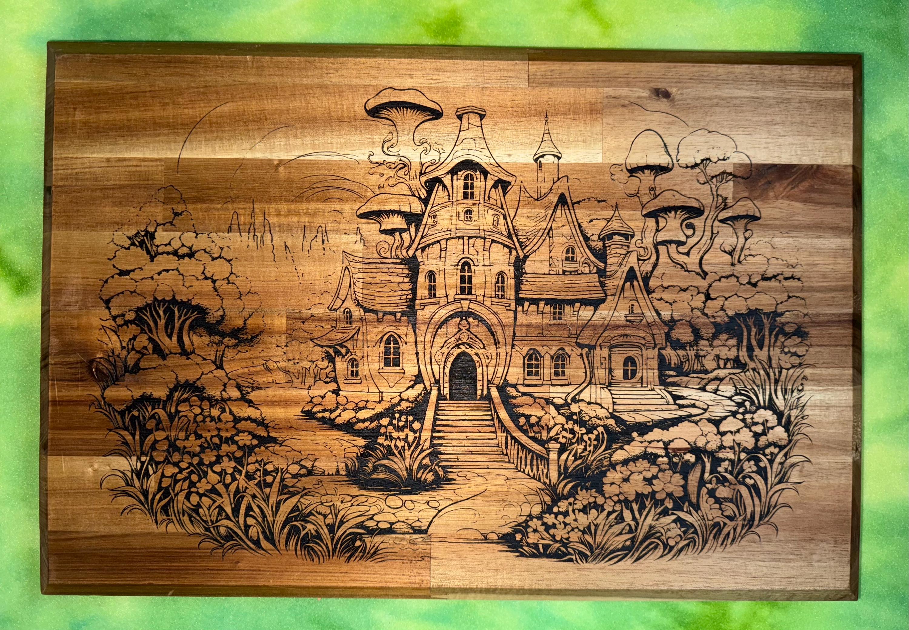 This is a 18" x 11" and 1 1/2 inches deep in a Castle Fairy Land Theme. The board is made of walnut and super nice quality. Finished with food grade mineral oil so it is functional as well. It will last a lifetime and makes a wonderful gift! Please check out our other listings! If you do not see one you like that is not a problem. Contact us and we will custom make one for you!