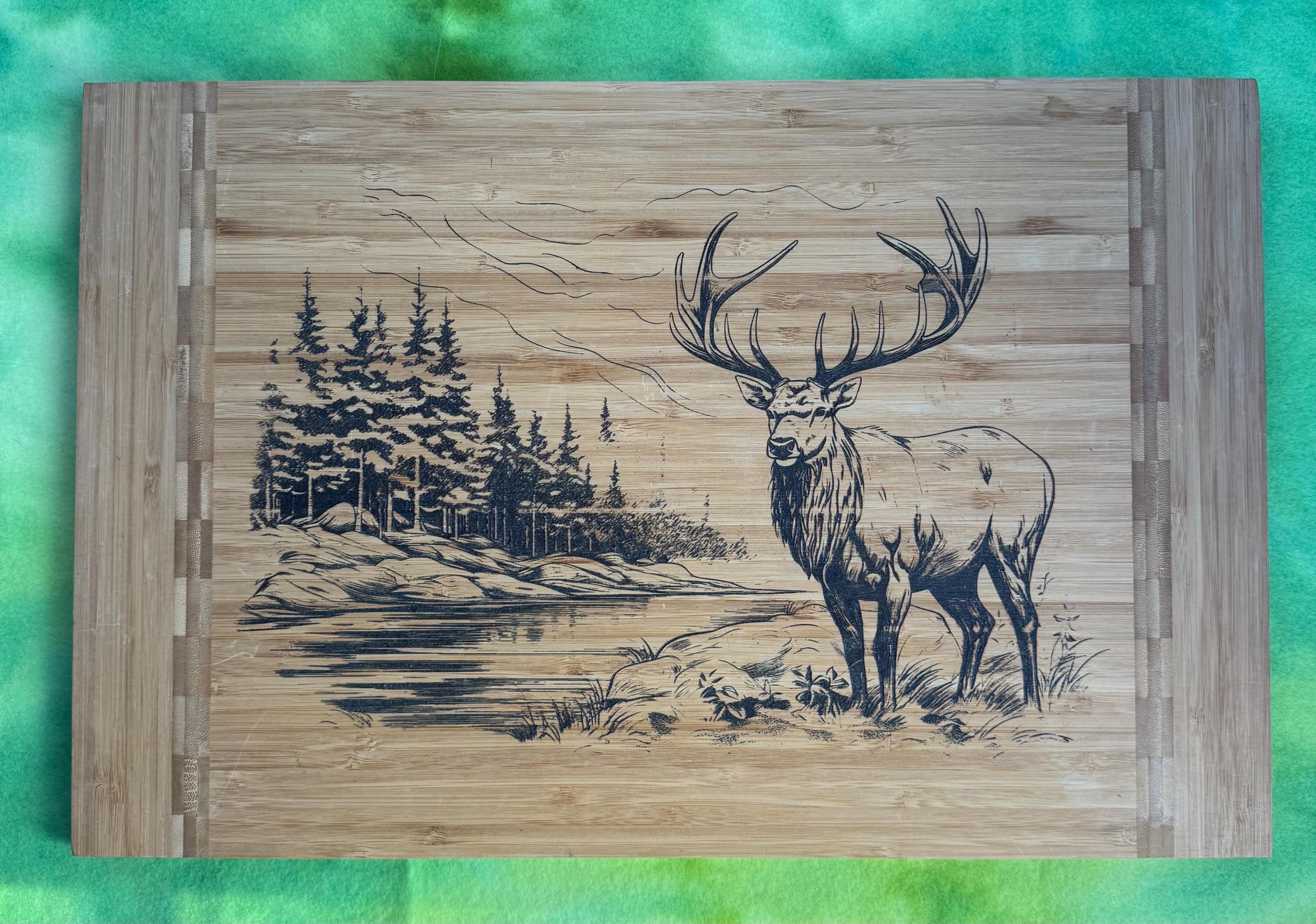 This is a 12" x 8" bamboo cutting board with butcher block inlays done in a Deer and nature theme! Finished with food grade mineral oil so it is functional as well. It will last a lifetime and makes a wonderful gift! Please check out our other listings! If you do not see one you like that is not a problem. Contact us via our website and we will custom make one for you!
