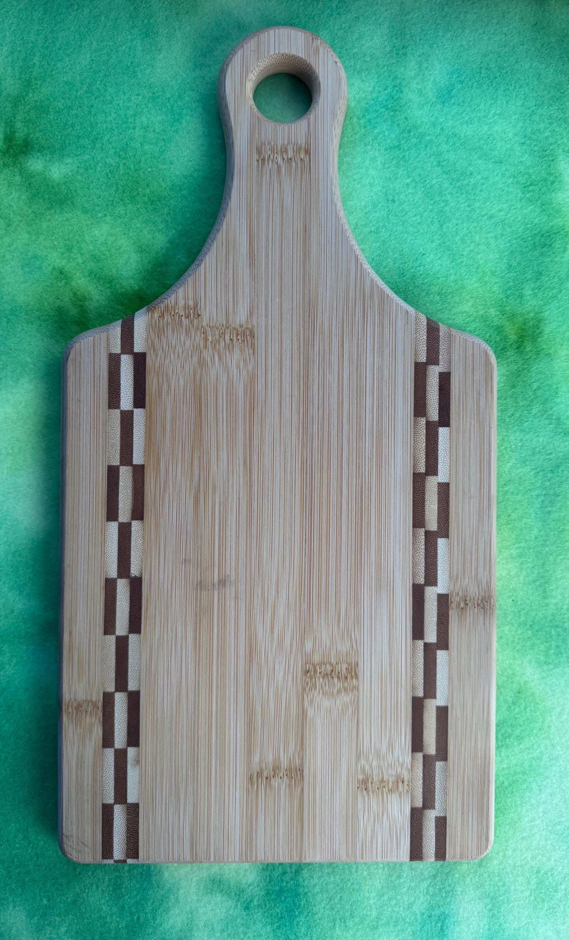 This is a 13" x 7" paddle bamboo cutting board with butcher block inlays done in a Flower theme! Finished with food grade mineral oil so it is functional as well. It will last a lifetime and makes a wonderful gift! Please check out our other listings! If you do not see one you like that is not a problem. Contact us via our website and we will custom make one for you!