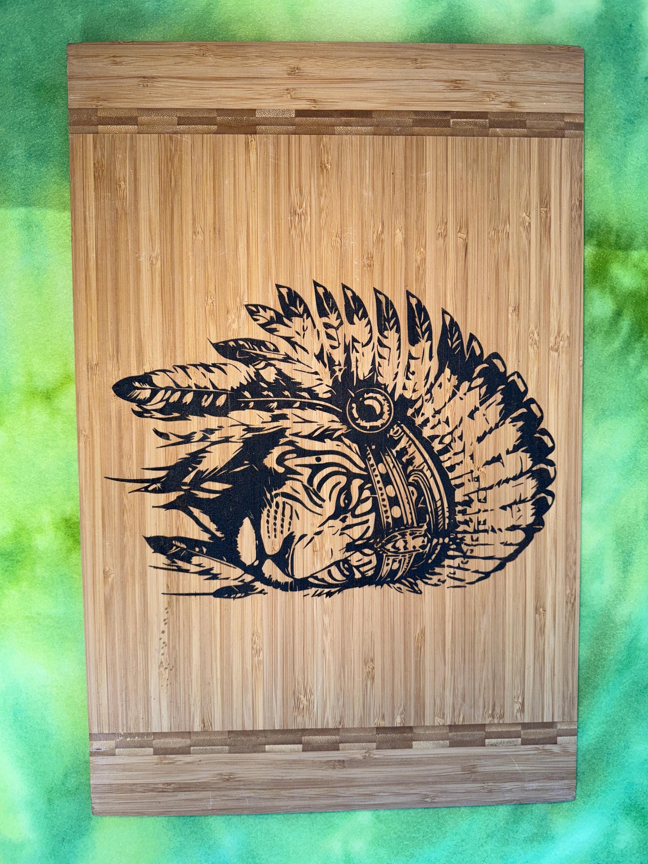 This is a 18" x 12" bamboo cutting board with butcher block inlays done in a Native American theme! Finished with food grade mineral oil so it is functional as well. It will last a lifetime and makes a wonderful gift! Please check out our other listings! If you do not see one you like that is not a problem. Contact us via our website and we will custom make one for you!