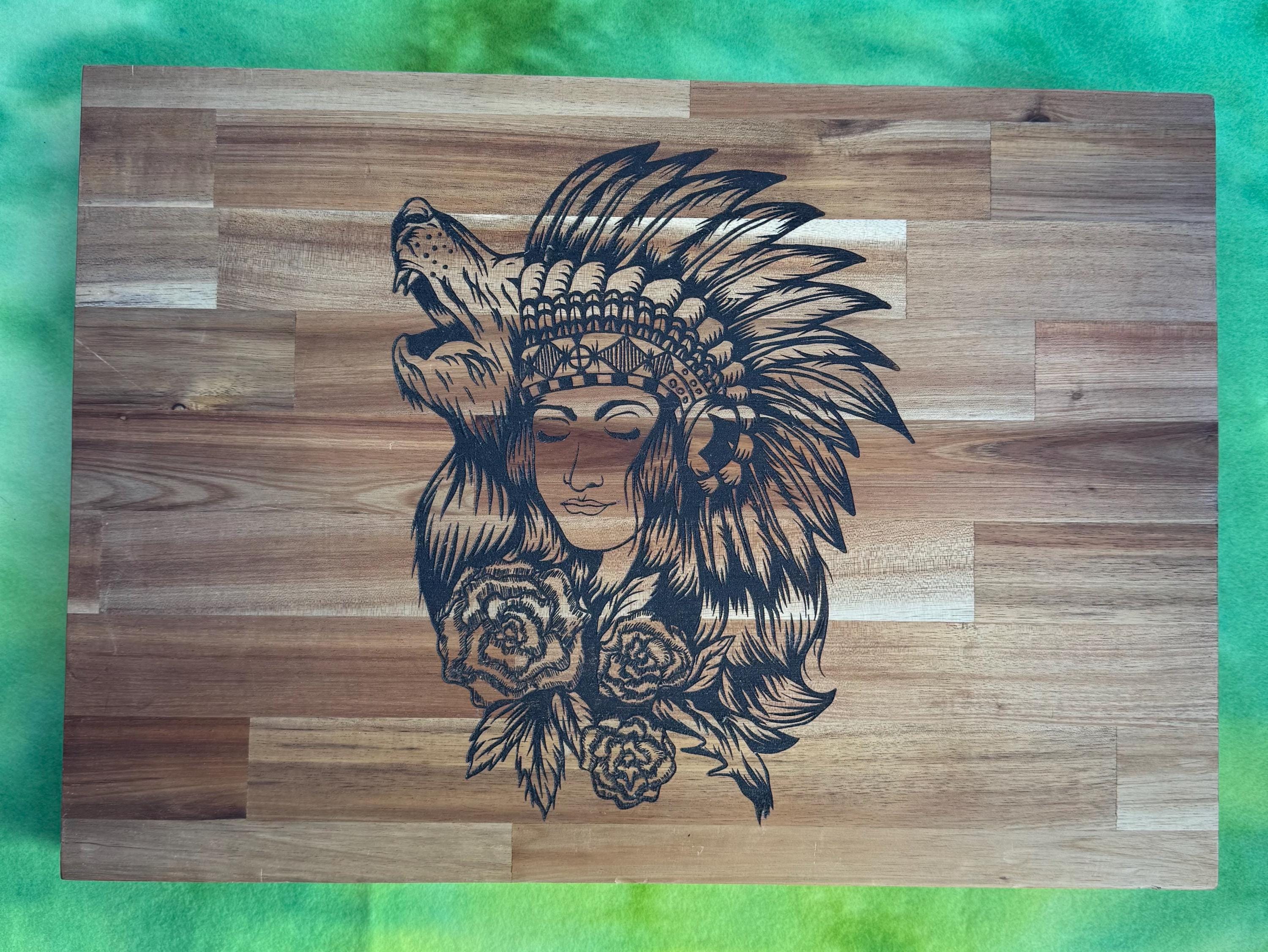 This is a 18" x 12" and 1 1/2 inches deep in a Native American Theme. The board is made of walnut butcher block and super nice quality. Finished with food grade mineral oil so it is functional as well. It will last a lifetime and makes a wonderful gift! Please check out our other listings! If you do not see one you like that is not a problem. Contact us and we will custom make one for you!