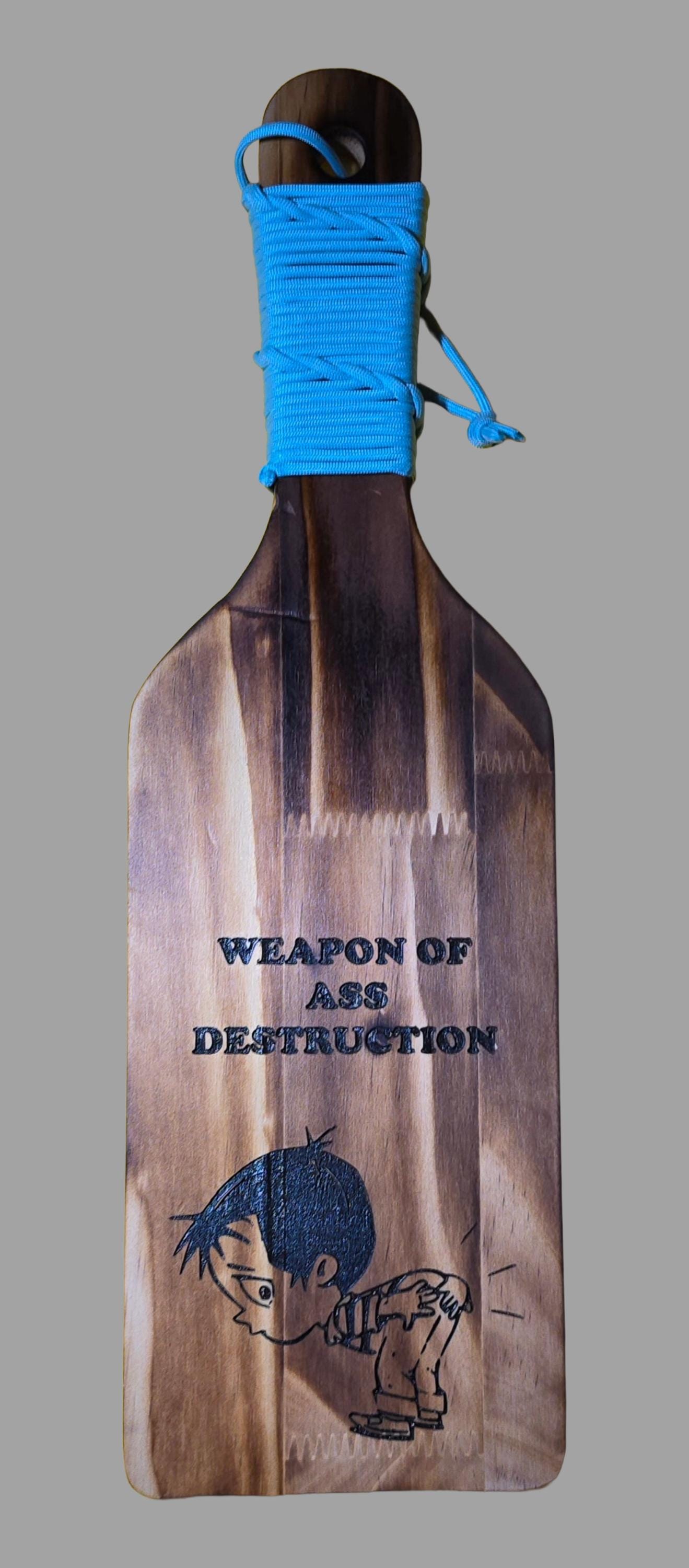 This is for a paddle made from pine. It is done in a Weapon of Ass Destruction theme and the handle is wrapped in para cord! It will last a lifetime and makes a wonderful gift! Please check out our other listings! If you do not see one you like that is not a problem. Contact us via our website and we will custom make one for you!