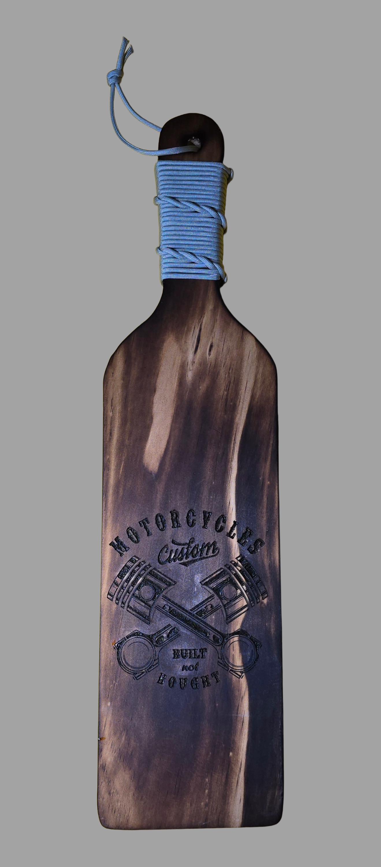 This is for a paddle made from pine. It is done in a Motorcycle theme and the handle is wrapped in para cord! It will last a lifetime and makes a wonderful gift! Please check out our other listings! If you do not see one you like that is not a problem. Contact us via our website and we will custom make one for you!