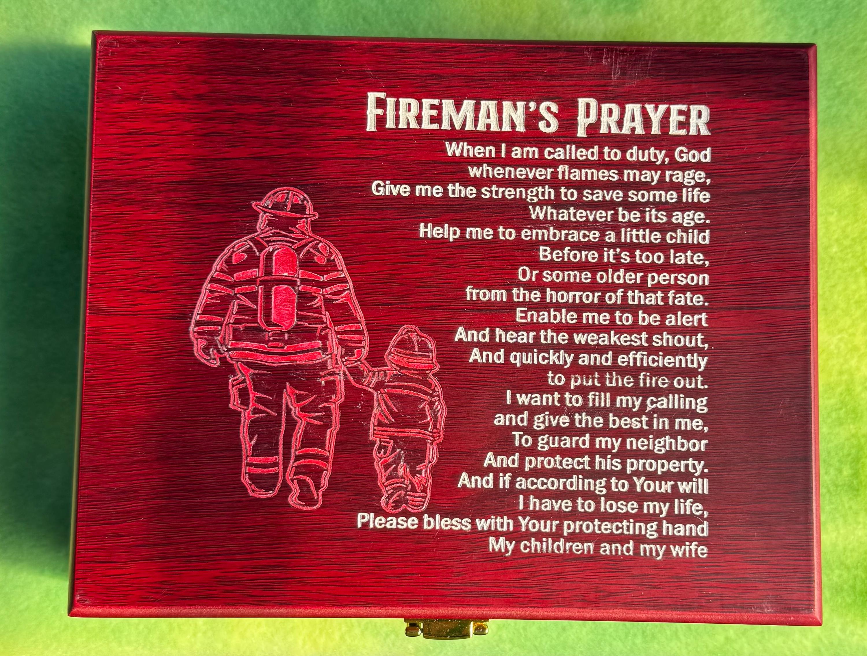 This knife set is in an Fire Fighter themed engraved Rose wood box and comes with the box, knife and a themed coin! This makes a great one of a kind gift! Please check out our shop and website for other listings!