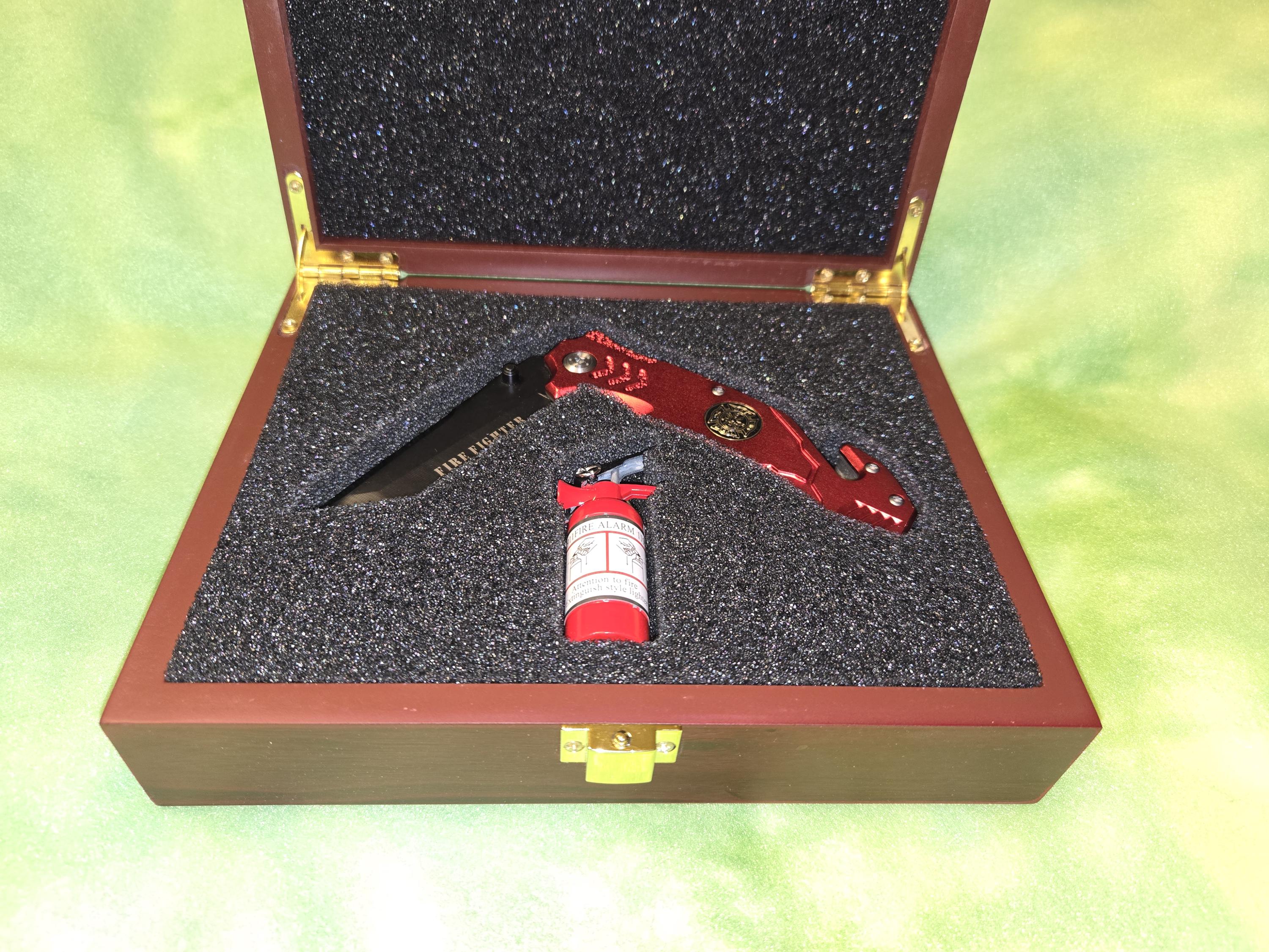 This knife set is in an engraved Rose wood box in a Fire Fighter theme and comes with the box, knife and a themed Lighter! This makes a great one of a kind gift! Please check out our shop and website for other listings!