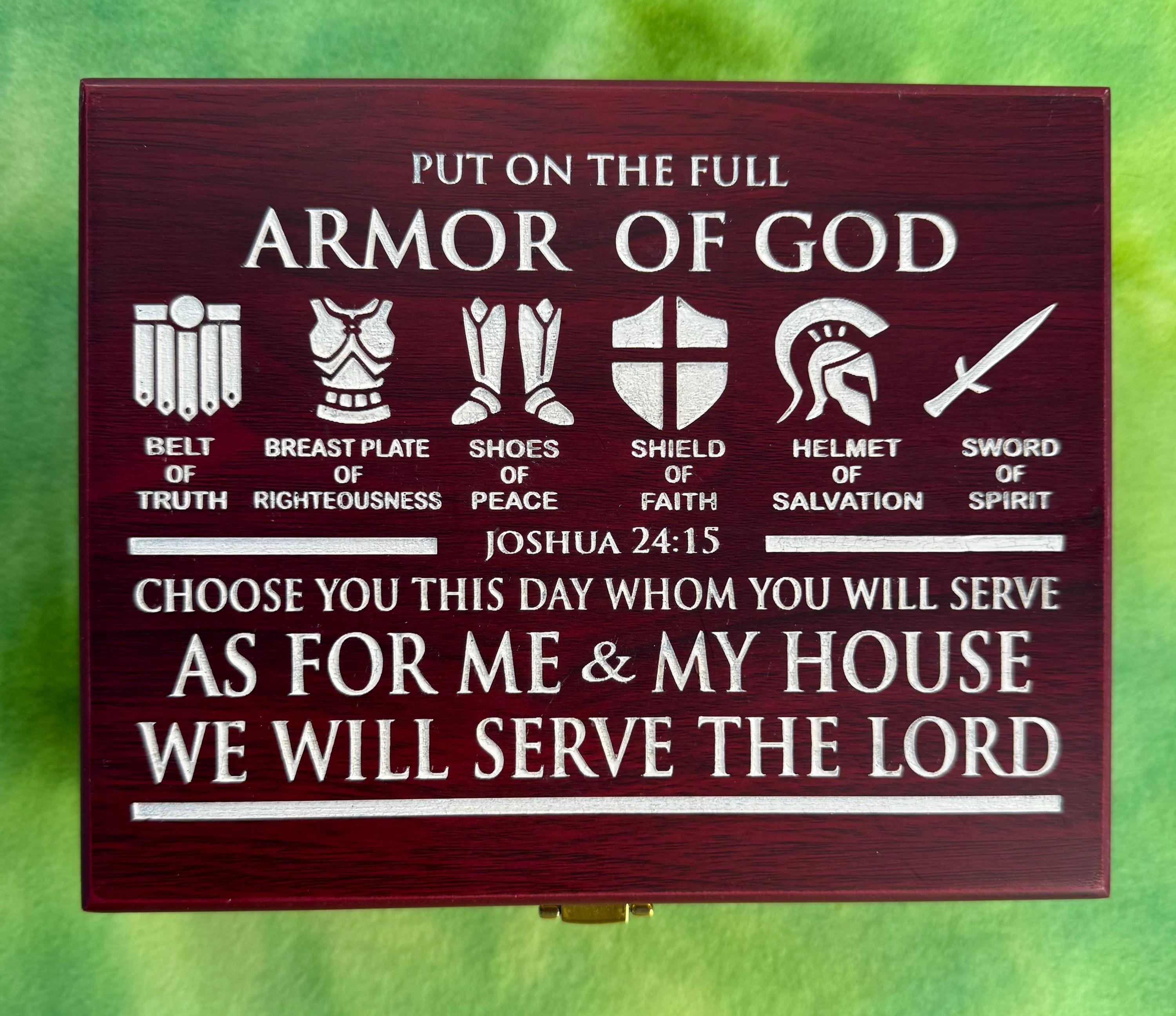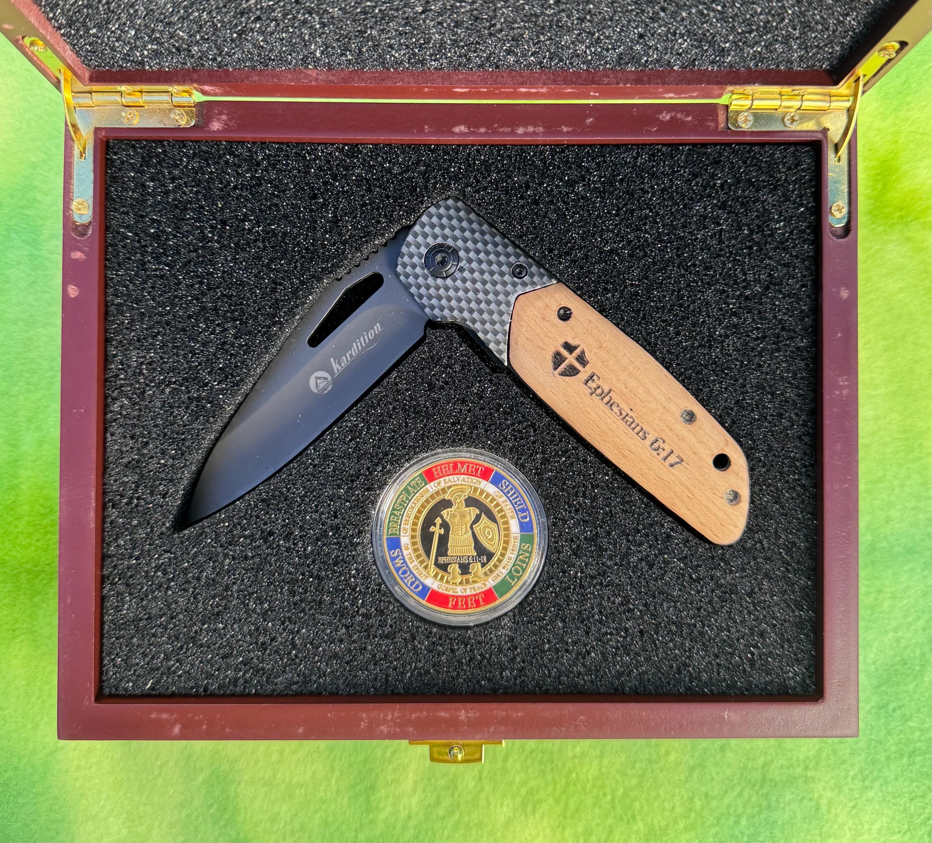 This knife set is in an engraved Rose wood box in aan Armor of God theme and comes with the box, knife and a Armor of God coin! This makes a great one of a kind gift! Please check out our shop and website for other listings!