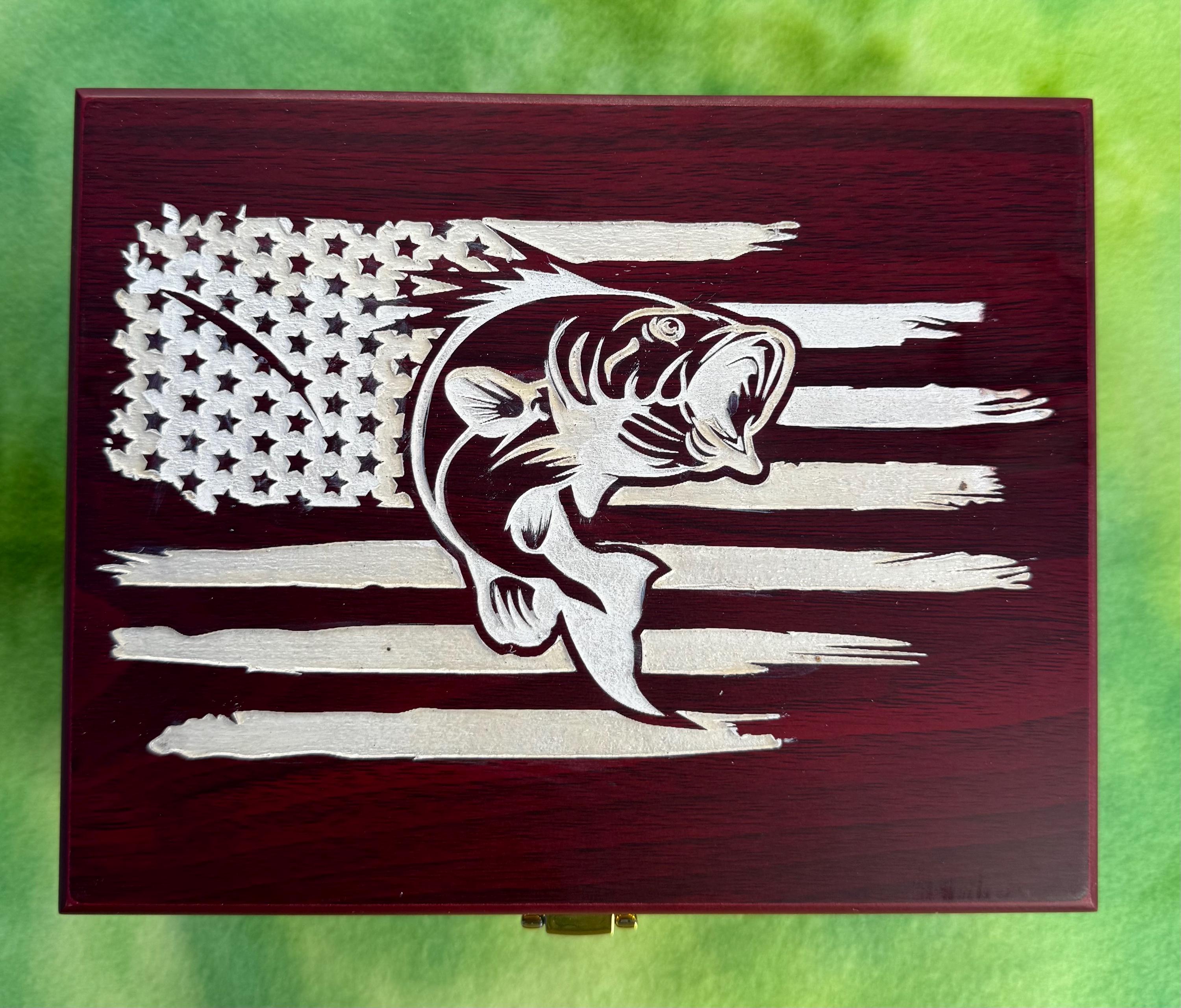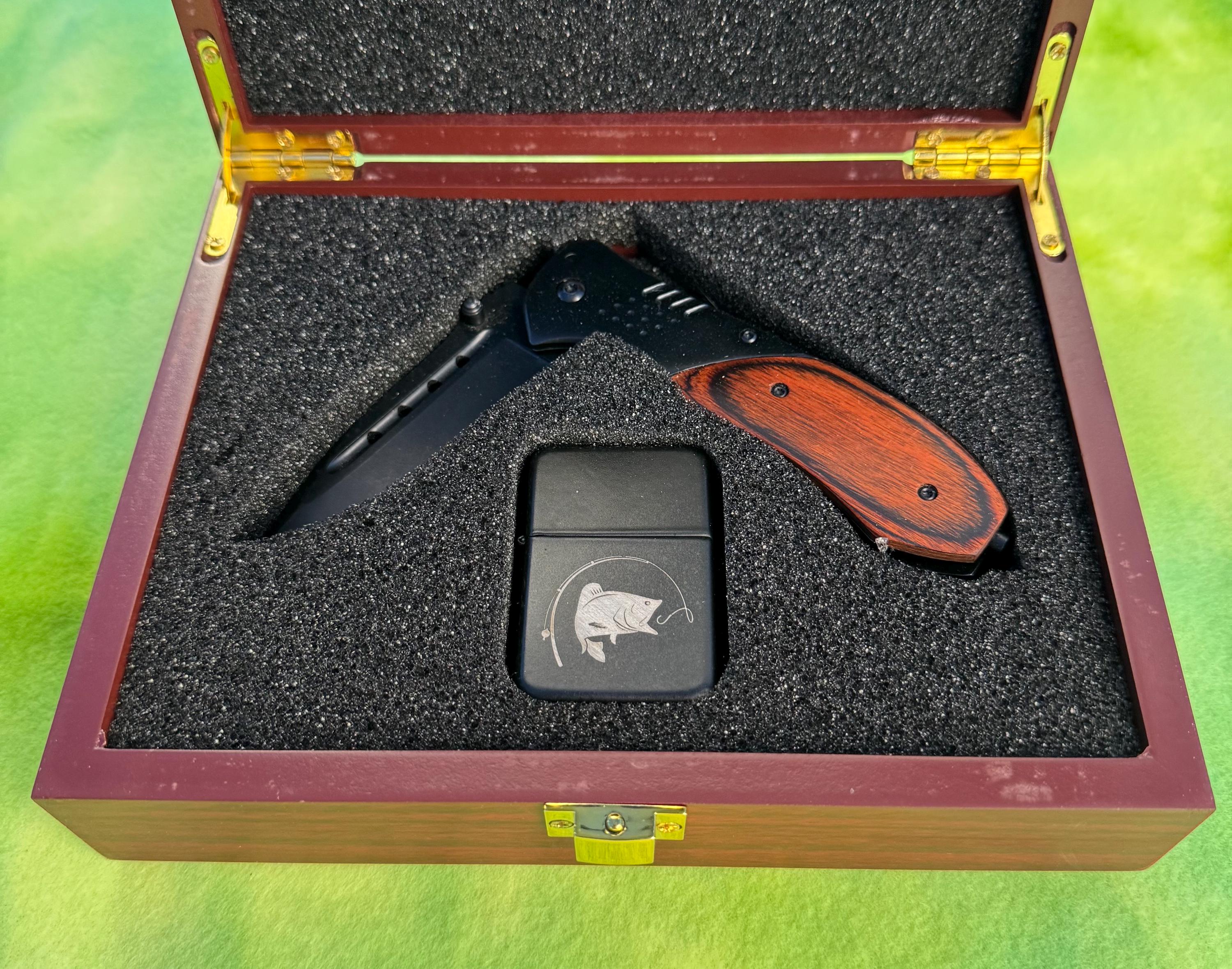 This knife set is in a Fishing Themed engraved Rose wood box and comes with the box, knife! This makes a great one of a kind gift! Please check out our shop and website for other listings!
