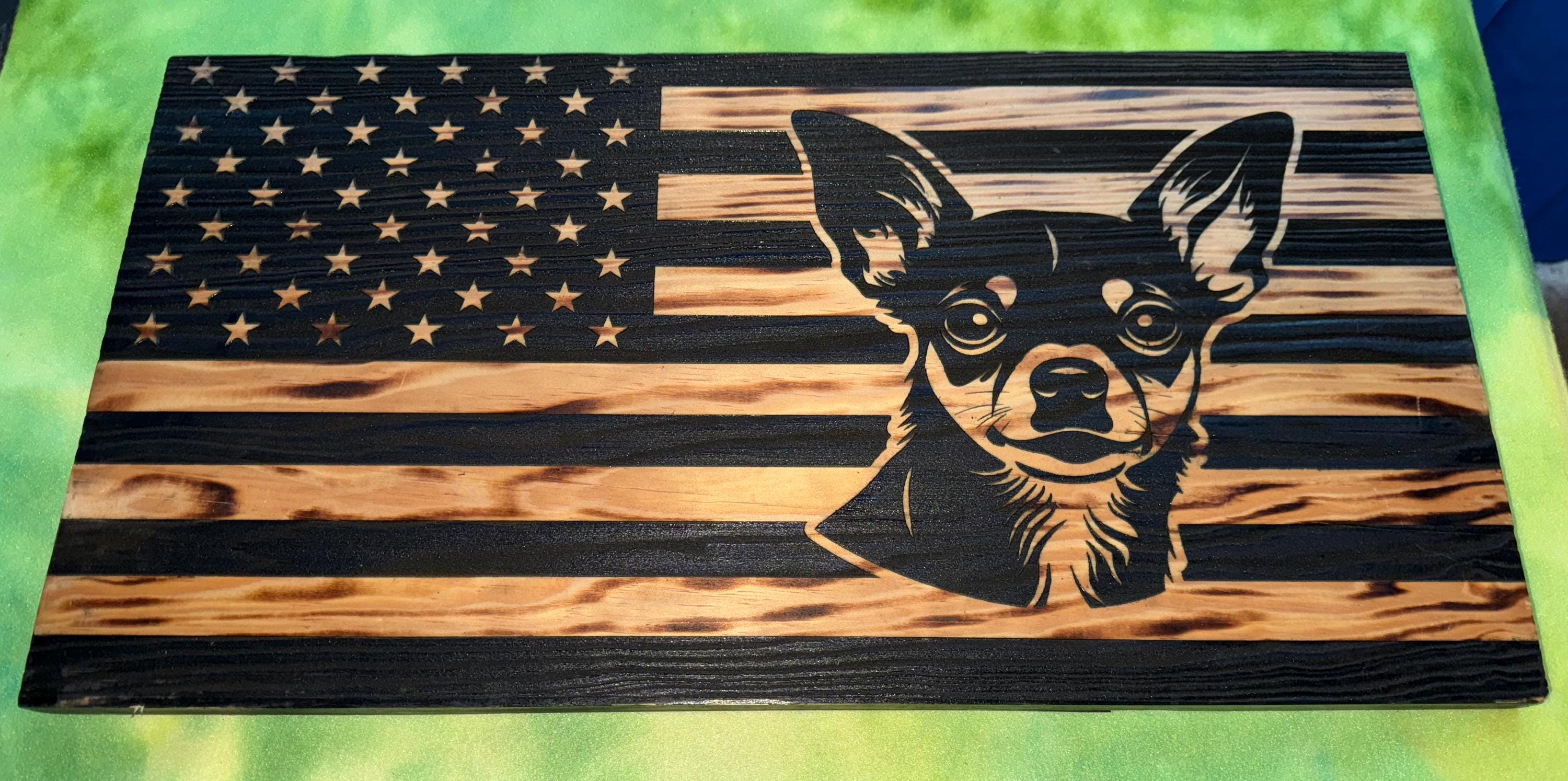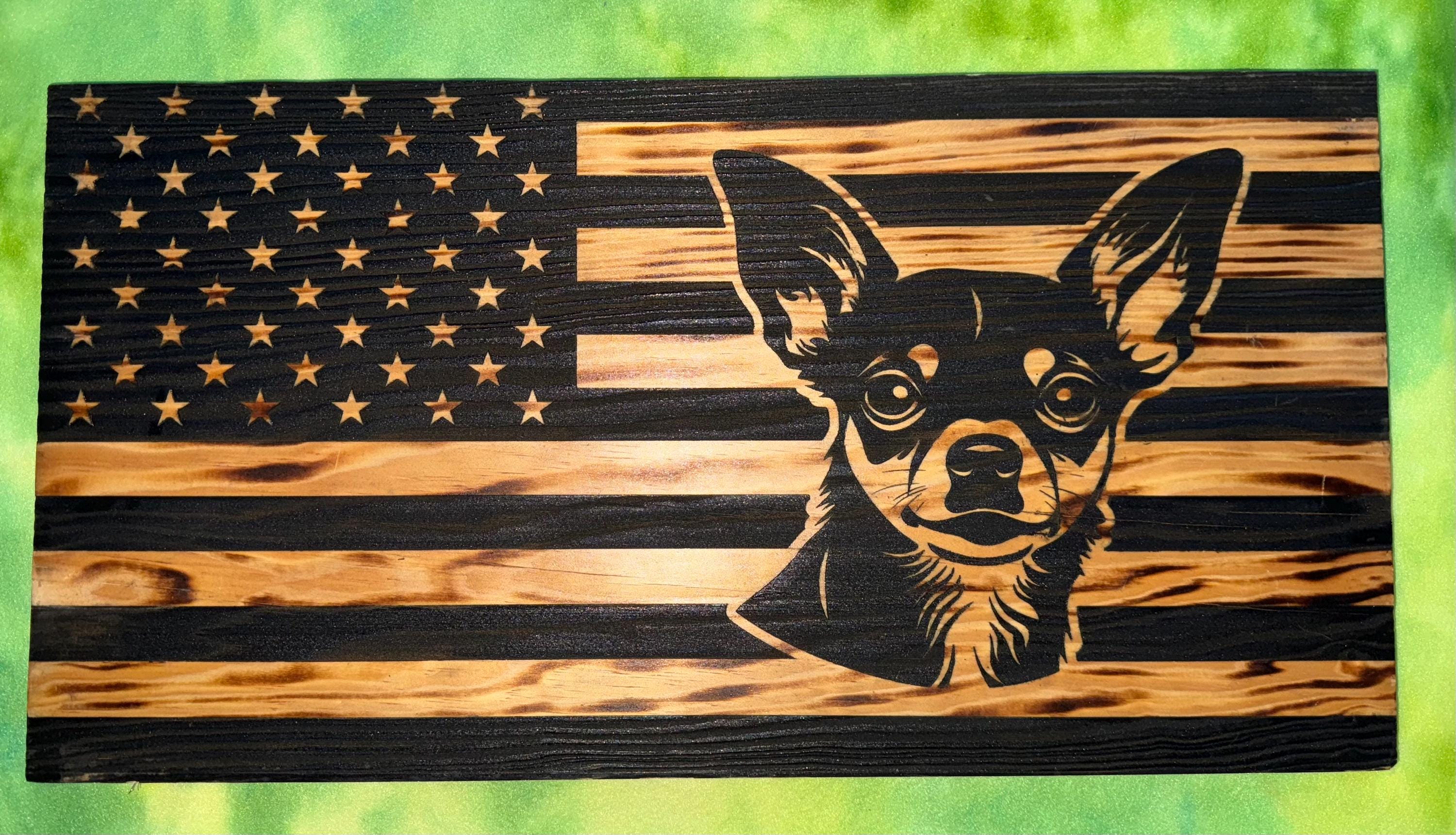 This beautiful flag is done in a Chihuahua Theme and is made on pine wood. It is 11" x 21". It will last a lifetime and makes a wonderful gift! Please check out our other listings! If you do not see one you like that is not a problem. Contact us via our website and we will custom make one for you! www.ltajcustoms.com