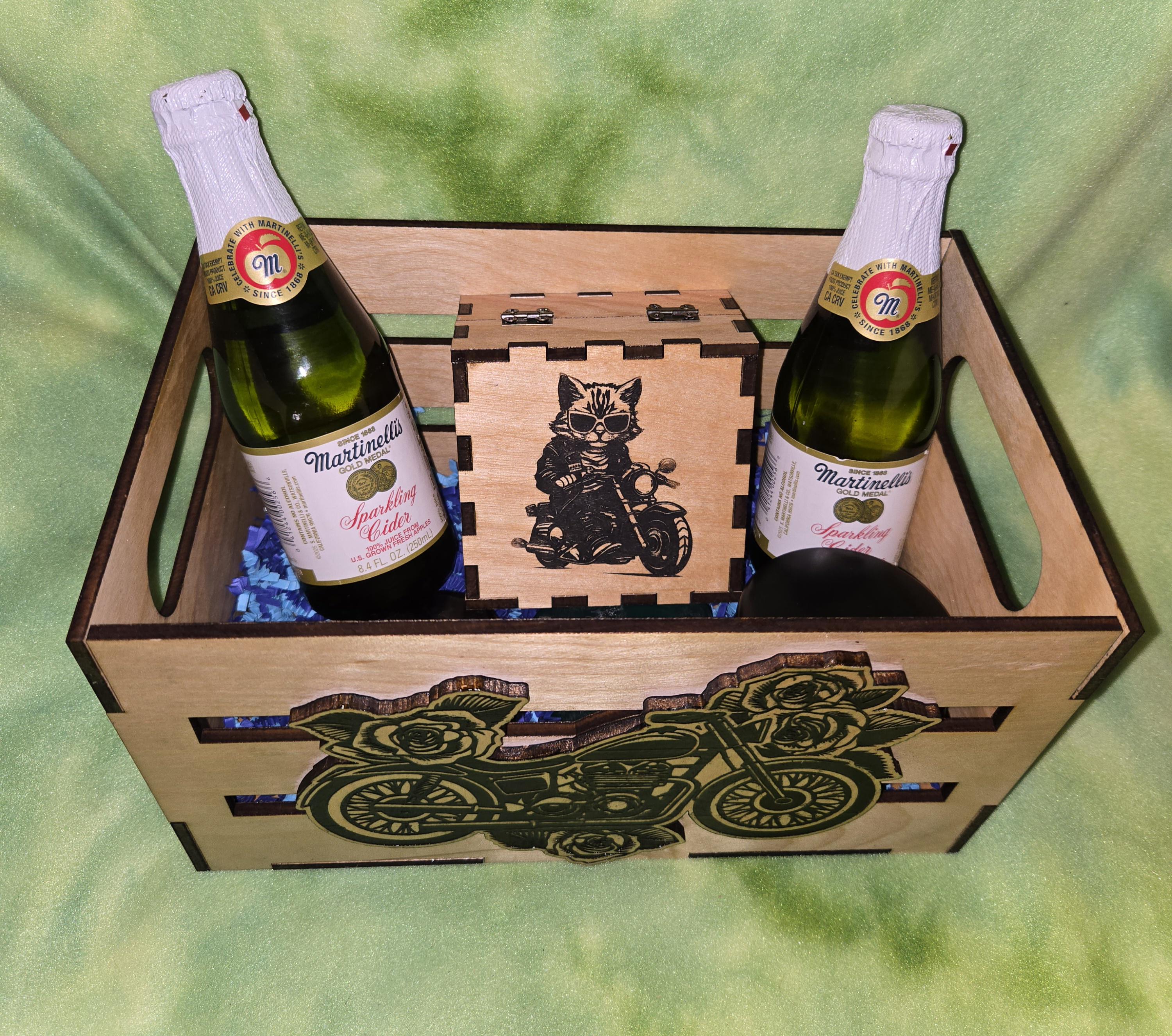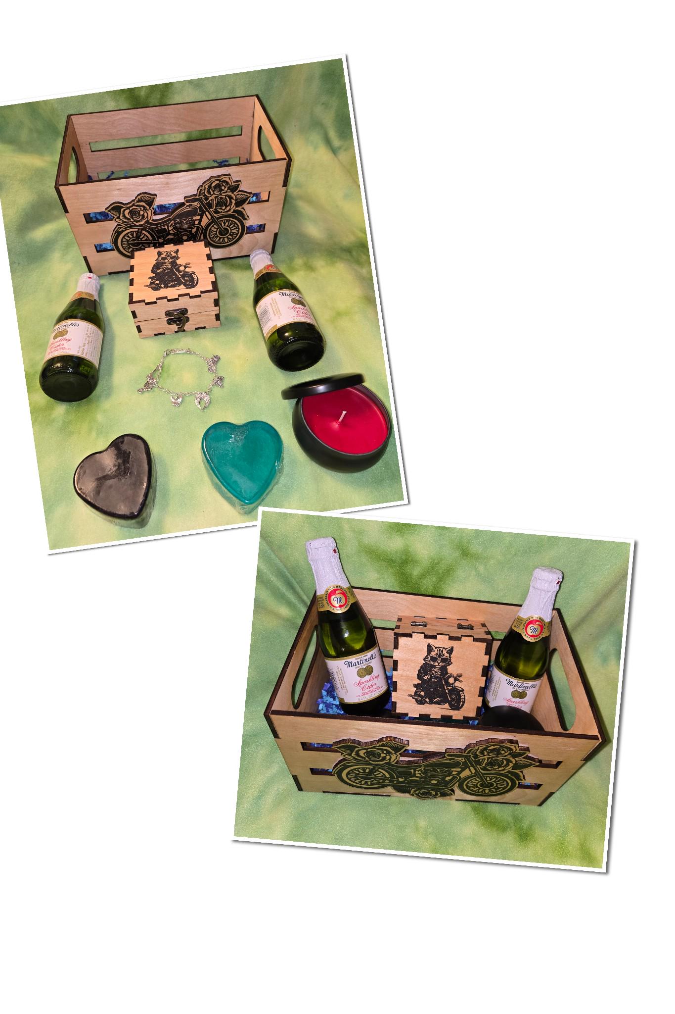 This gift box makes a great gift for valentine's day, wedding or just to say I Love You to that special person. This box is done in a Motorcycle theme and comes with the box, 2 bottles of sparkling water, 2 heart shped bars of soap (his and hers), A candle in engraved and a handmade charm braclet in a custom engrave box. These come with the crape paper and cellophane bag but not shipped in the bag. Get this today. If you want a custom on done please send us a message and we can do that for you! Thanks for reading and we hope you will check all our listings!